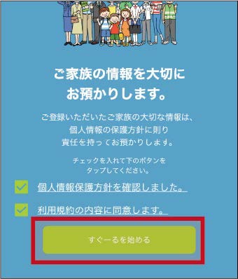 護方針の確認と利用規約の内容に同意にチェックを入れて「すぐーる を始める」