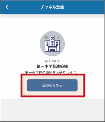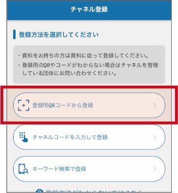 新規利用の方は「新規利用登録」から、利用中の方はチャネル追加ボタンをタップします。「登録用QRコードから登録」をタップし、右のQRコードを読み取ります。この時、カメラ機能へのアクセスを許可してください。該当するチャネルが表示されるので「登録を始める」をタップします。