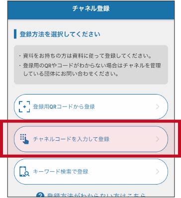 登録方法選択画面から、「チャネルコードを入力」をタップします。以下のチャネルコードを入力します。
